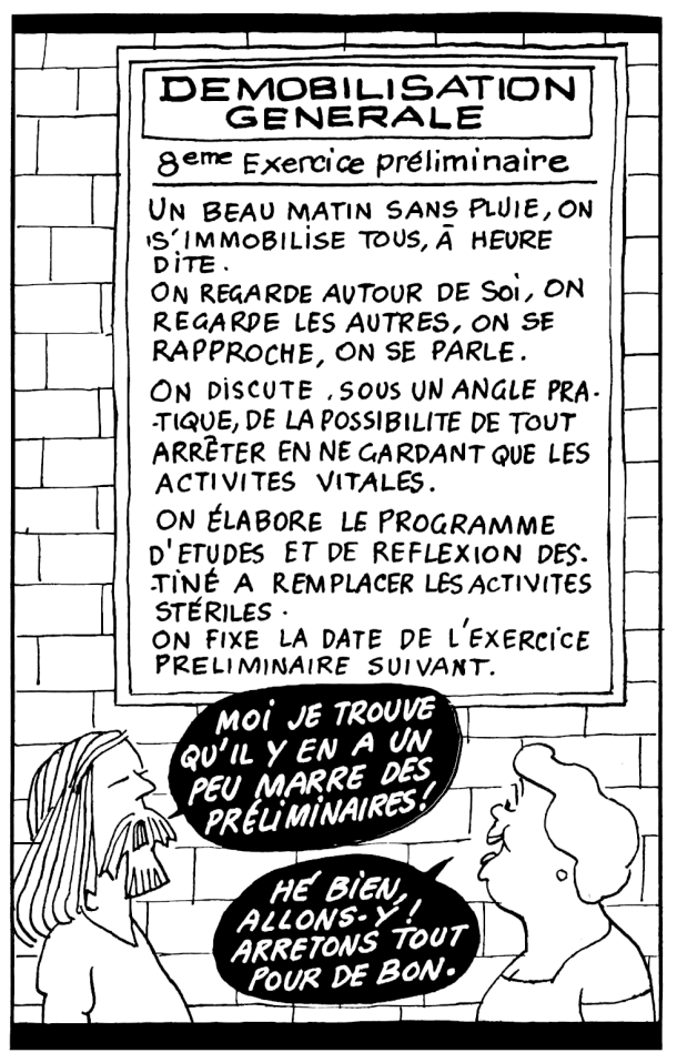 Le postulat de l’An 01 c’est “On arrête tout, on réfléchit, et c’est pas triste”.