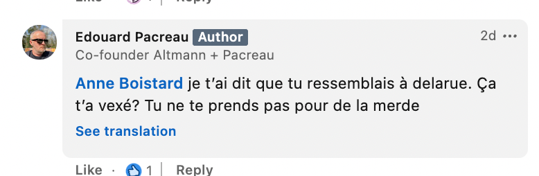 2/ ce post LinkedIn d’un Ancien de la pub qui voudrait bien apprendre à ces générations de petits merdeux arrogants comment être humbles. Je vous invite à lire les commentaires. Déjà, parce que les commentaires positifs vous donneront une très bonne idée de qui bloquer/unfollow et quelles écoles éviter. Aussi, parce que beaucoup de choses intelligentes sont déjà dites dans ceux qui prennent le risque de se prendre un torrent de vomi pour avoir osé attaquer les paroles de l’Ancien.Réagir à cet article nous semble nécessaire, parce que le sujet n’est pas l’Ancien en question - des Anciens comme ça il y en a plein d’une part, et la volonté du post est évidemment de provoquer - le sujet est que ce post est le symptôme d’un débat profond dans cette industrie, celui de celleux qui décident de ne pas accepter les règles contre celleux qui les ont acceptées, ont morflé, et se disent qu’il est normal que les autres morflent aussi (un grand bizutage massif en somme).Mais voilà : d’une part, tout a été dit, dans les commentaires, et dans les stories BTA qui a eu, il y a quelques jours, le même débat.