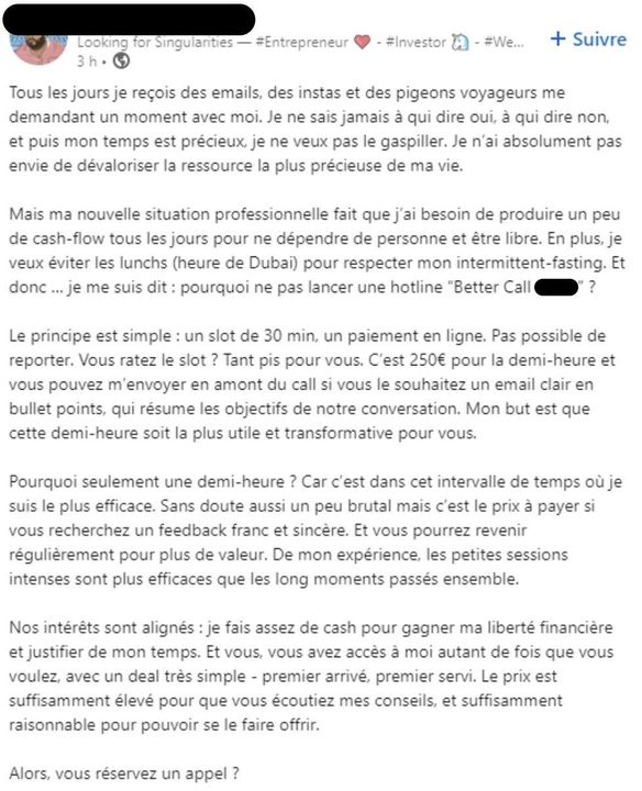 On ne se parle pas seulement du temps de rédaction du post hein. On se parle du temps de cerveau consacré à imaginer, planifier, penser à de nouvelles idées, se dire que “ouais, franchement ça va grave intéresser les gens de savoir que dans dans ma boîte de winners, si tu viens pas samedi pas la peine de revenir dimanche”. Aux grandes heures de Clubhouse, il y avait des gens qui tenaient trois talks par jour pour partager leur succès. Je sais pas vous, mais je me dis que peut-être, maybe, il y aurait peut-être une relation inversement proportionnelle entre le temps passé à se la péter et le temps passé à faire des vrais trucs utiles. Je sais pas, je demande.