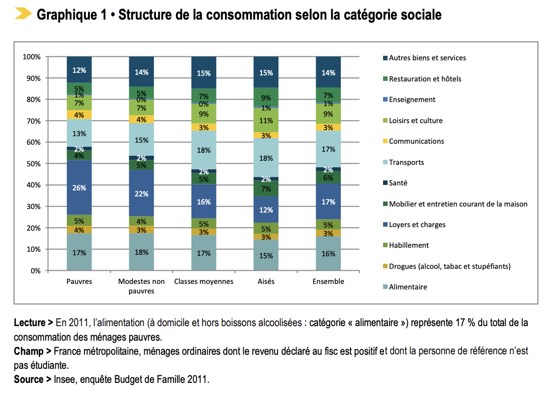 Un truc vraiment intéressant, je trouve. Dans toutes ces études, et même le comparatif de l’Observatoire des Inégalités entre les ouvriers et les cadres on voit… si on regarde bien… que la proportion, chez les foyers moins riches, qui va aux dépenses de logement (18,4 vs. 13,4) et de transports (17,5 vs. 16,8) est pas mal plus élevée.