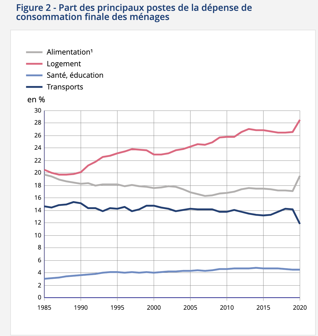 Si on regarde de nouveau l’étude de la Drees (avec ses chiffres un peu vieux certes, mais une étude plus récente est inconnue à cette à Drees) on constate qu’en effet les dépenses d’alimentation ont baissé dans la structuration globale des dépenses des ménages. Il y a plusieurs explications à ça, par exemple le fait que le coût de la bouffe à baissé au fil du temps (et c’est évidemment à cause des pauvres qui achètent les saloperies qu’on leur file, pas des distributeurs qui pressurisent les producteurs et achètent de la merde produite n’importe où et n’importe comment). Il y a aussi le fait que cette PROPORTION a chuté… parce que d’autres coûts ont explosé, comme le logement, tiens voilà un petit graph de l’INSEE en 2020 (ouais 2020, d’où la baisse soudaine des dépenses de transport et la hausse des coûts de logement, mais vous voyez la tendance).