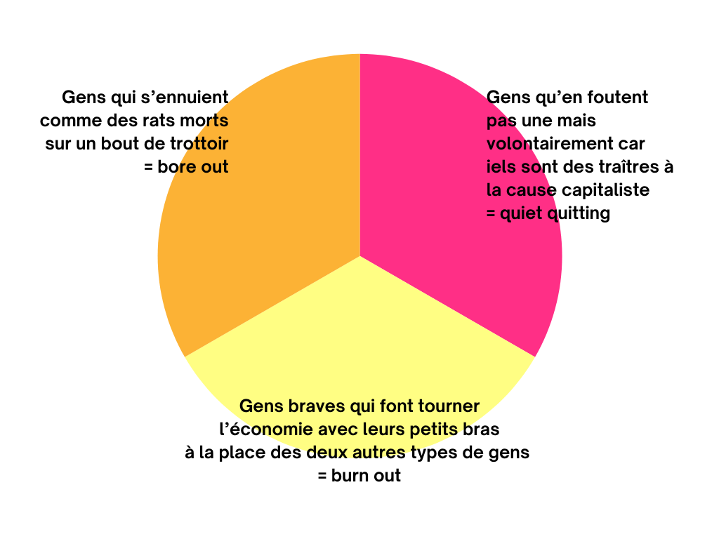 C’est essentiel d’en parler - c’est pour ça que je le fais v’voyez - c’est juste que… c’est quand même la tarte à la crème des discussions RH. Le truc dont t’entends même parler au JT de 13h entre un reportage sur le Billard Club de Saint-Capraise de Lalinde et le concours de la courge (le concourge ?) à Jons. J’ai du mal à expliquer la popularité démesurée du concept, si ce n’est qu’il y a probablement, pour les journalistes, un truc un peu crousti-paradoxal à dire “hihi c’est ironique, y’a des gens qui craquent parce qu’iels ont trop de taf, et des gens qui craquent parce qu’iels se font chier, oh ben didon RHOOO”.